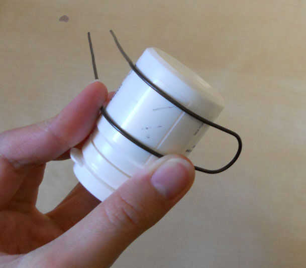 Tome otro trozo de cable y doble alrededor de un objeto de pasador en un anillo para su tamaño de huevo blanco. Que algún cable se superponen como se muestra. Este anillo será el huevo alrededor de 1cm por debajo del punto más ancho de la taza, use un pasador/objeto que coincida con el tamaño de huevo de su destino. Mis huevos son "Grandes" por lo que mi anillo es 1.5" pulgadas de diámetro.