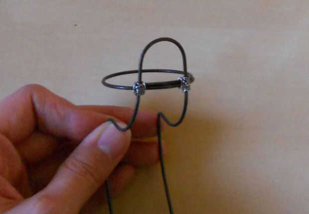 Doble la parte superior del cable hacia atrás la pierna de modo que se reúne con el anillo, entre las dos patas delanteras y se coloca muy bien, según los cuadros de referencia. Revise de nuevo el equilibrio potencial. No queremos la huevera se vuelque hacia atrás cuando el huevo está en el lugar.