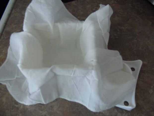 He colocado el molde en un recipiente y había forrada con paño de queso. El tazón de fuente captura el líquido que drena de la parte inferior del molde.