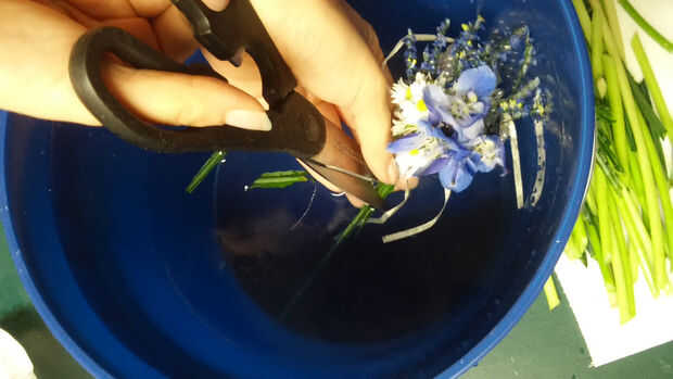Coloque el vástago en el cubo de agua y corte mientras que los tallos están sumergidos. Esto va con absorción de agua de la flor y las flores duran más tiempo.