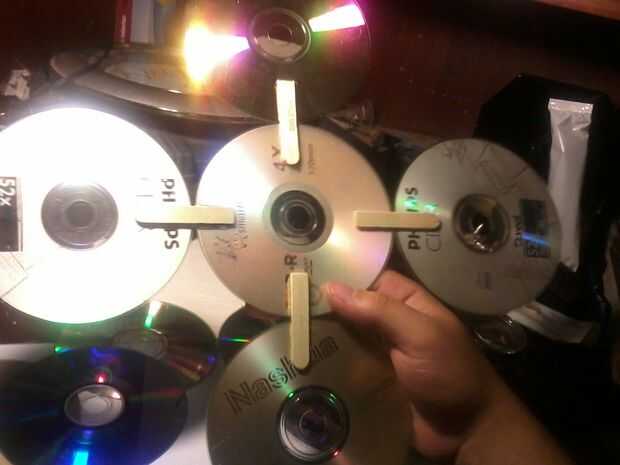 Coloque un CD que será el centro de su reloj alrededor de cuatro otros CDs. agregar algunas paletas palos para sostener el lugar de CDsin