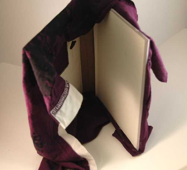 El siguiente paso es pegar la tela hacia el exterior de la cubierta del libro. Usé pegamento de aerosol para esto.