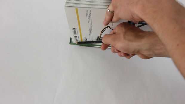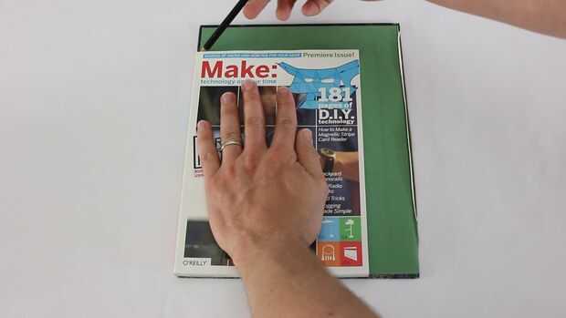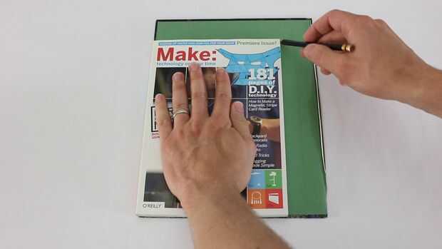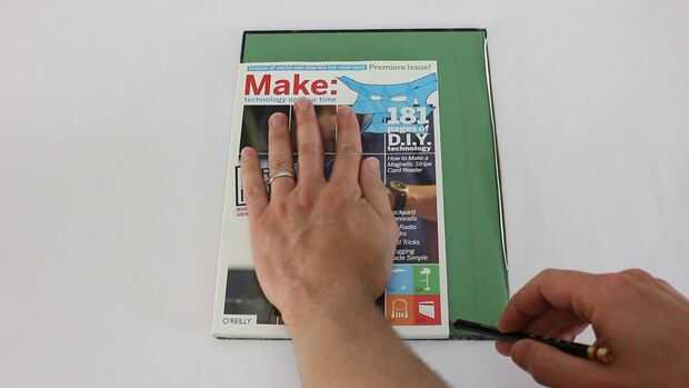 Apilan cuatro volúmenes de mi revista. Yo les coloca en una esquina de la cubierta del libro. Entonces trazó el contorno con un lápiz. A continuación, giré la pila de revistas en su lado y trazó el contorno de este lado. Hacerlo para los lados, parte superior, inferior y trasera de la colección. Las vueltas serán visibles por lo que no necesitará hacer una pieza para el lado de la columna vertebral.