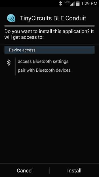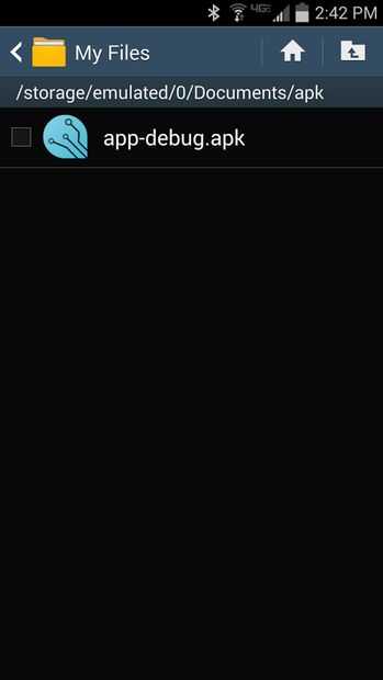 En el teléfono, usted necesita ir a la configuración y marque la casilla de fuentes desconocidas . Esto le permitirá instalarse las apps que no son de la tienda de Google play. A continuación, vaya a MyFiles -> AllFiles -> almacenamiento -> documentos > Apk. Toque en el app-debug.apk y se le pedirá instalar la aplicación pidiendo permisos de notificación y Bluetooth.