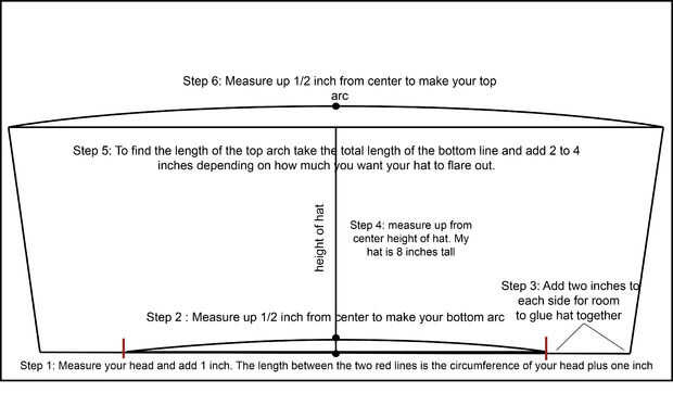 Primero se corta la cartulina según la plantilla. Deberá medir alrededor de su cabeza con una cinta métrica (como la clase que uso para coser) o una cadena alrededor de su cabeza y medir la cuerda con una regla. Agregue 1 pulgada a la medida, esto le dará la longitud que usted necesita poner plantilla propia. He utilizado esta plantilla para hacer un sombrero de muestra para la muñeca de mis hijas (no quería perder una hoja entera de cartulina haciendo un sombrero de tamaño completo. Utilizará la misma técnica para hacer un sombrero más grande. Una vez que ha hecho sus medidas y creada la plantilla, cortar hacia fuera y forman en su cabeza. Una vez ajustado derecho... Asegúrese de que está muy flojo montaje en la cabeza en este momento... usar una pistola de pegamento pegamento sombrero arriba juntos. Asegúrese de que el sombrero de la forma cónica para que la parte superior es más grande que la parte inferior. El agujero se Haz considerablemente más pequeño una vez que usted coloque el borde así que tenga cuidado no hacer el sombrero demasiado apretado.
