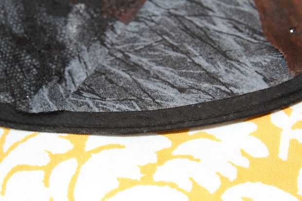 Utilice la pistola encoladora para pegar la tubería negra alrededor del borde de su ala y el borde de la parte superior del sombrero. La tubería será tapar los bordes sucios de la tela. Sí nos va a dejar la parte superior del sombrero abierto. A menos que alguien es muy alto tienen ni idea que es abierto. Y aun si notan, bien un derecho de sombrerero loco???