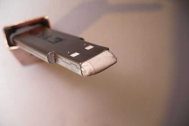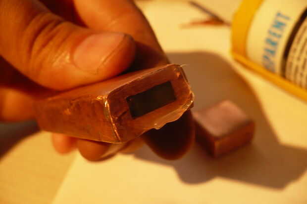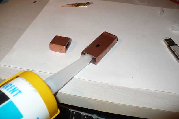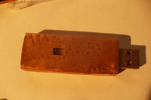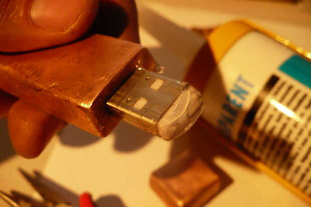 Primero tienes que llenar el conector USB con el papel para que no llenan de silicona cuando se empuja a través de. Luego llenan el cuerpo de silicona e insertar la memoria flash. Raspe el exceso de silicón de los agujeros del LED para que tenga una superficie lisa.