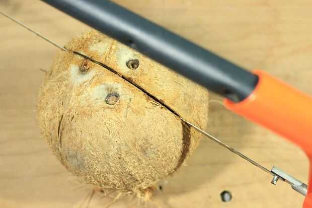 Ahora es tiempo de vio tu coco en dos piezas. Fui a lo largo de mi corte, pero otra vez, tamaño hasta el coco para su pecho acunando necesita. Una sierra de mano funcionaría bien para este trabajo.