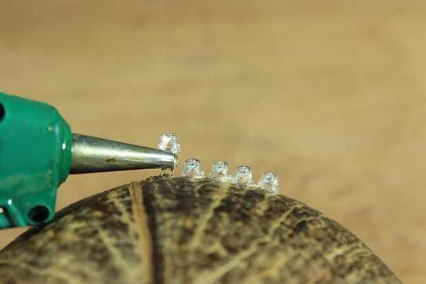 Utilice una pistola de pegamento para pegar los LEDs en los agujeros perforados en el paso anterior, la atención ánodo y el cátodo.