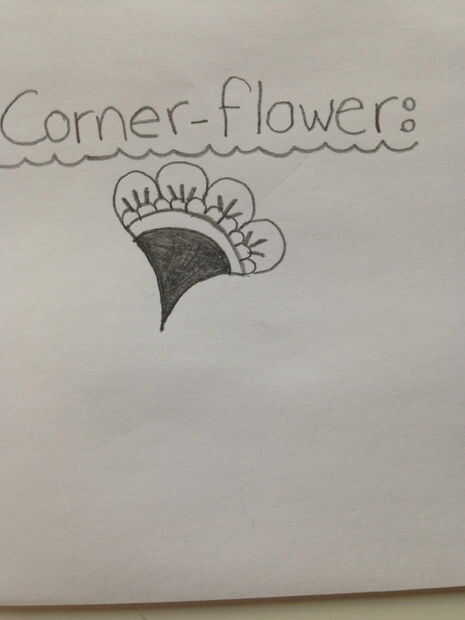 De la esquina de flores (cuadro 8): Esto es una segunda forma de flor de estilo henna y se coloca en las esquinas. Su base consiste en un bloque sólido dentro de la esquina, bombear hacia fuera en un semicírculo. Esta parte abultada está delineada con una línea de semicírculos. Ahora se agregan los pétalos, que son redondos en vez de Plaza y una línea adicional se agrega a la "V".