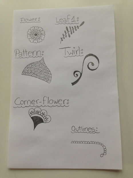 Esquemas (cuadro 9): Este es un aspecto muy importante de tatuajes de henna como la esquematización trae al unísono en el tatuaje. Cada característica está delineada con al menos que el primer esbozo se agregan una sola línea y semicírculos sobre todo. Al terminar el tatuaje entero lo es importante comprobar si todas las características están conectados realmente en al menos un punto.