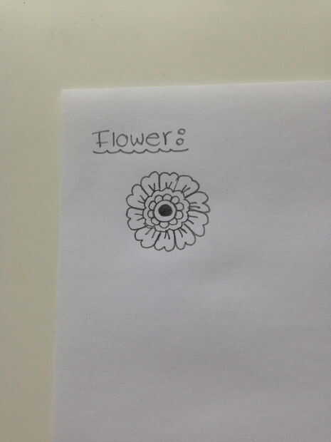 Flores (cuadro 2): La primera característica básica es una especie de flor, que se compone de diferentes capas. Dibuja un punto rodeado por un círculo de color. Luego coloque pequeños semicírculos en el contorno del círculo. Esta forma del esquema. Ahora dibuje los pétalos de la flor en la línea previamente dibujada. Los pétalos son redondos cuadrados con un pequeño guión en la línea exterior. Coloque una "V" pequeña en cada pétalo.