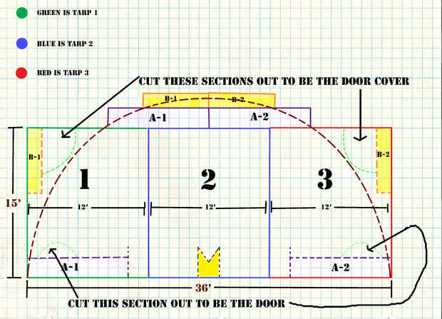 Coche una estaca en el suelo en el centro del corte M donde el lienzo sería si no se había cortado. ATA una cuerda a este juego y mida 18' y atar una pluma o la máquina en este momento. Desde una de las esquinas y utilizar la cuerda como un compás dibuja un arca a la otra esquina esto hará que una forma de medio círculo en la lona como se ve en el diagrama (puede haber un poco de falta donde a-1 y A-2 cubrir el lienzo grande pero no importa mucho.. .you puede Agregar pedazos aquí si usted quiere hacer todo incluso.