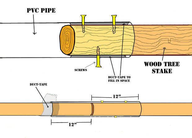 Hay algunas maneras para obtener postes para su tipi. Es la forma más barata ir a los bosques y, otra forma es comprarlas precortadas. Pero lo que hicimos fue comprar estacas del árbol y combinar dos estacas de 10' para hacer 20' postes que son más fáciles de llevar encima nuestro Jeep. Tenemos PVC que pasó de los polos (2 1/2" PVC) y cortarlas en tiras de 2'. Por un lado nos envuelve cinta adhesiva alrededor de poste Acomódesela en la PVC entonces se inserta 1' y usados tres tornillos para fijarla permanentemente al polo entonces envuelven el otro polo con cinta adhesiva por lo que cabe cómodamente pero podría tomar aparte cuando nos fuimos, hicimos esto con todos los polos. Cuando ponemos encima de los postes que utilizamos cinta adhesiva fueron que tome abajo fue para que sea menos probable que se desintegraría colocando los polos.