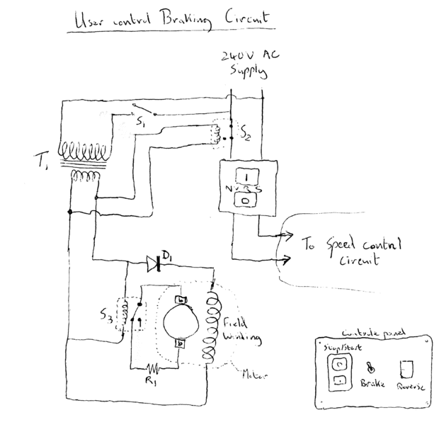Mi solución es un pulsador (S1), normalmente abierto,, cuando (y apretado), hace un circuito separado que alimenta la bobina de campo y energiza un relé del solenoide (S3), que cortos las escobillas a través del resistor R1.