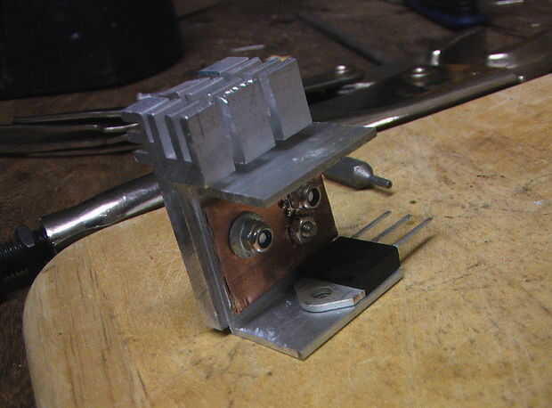 He utilizado una sección de aluminio (igual que en la cama del torno) canalización empernado junto con un poco de la vieja del disipador de calor rescatado de una computadora desechada PSU, con un poco de tubo de cobre aplanado.