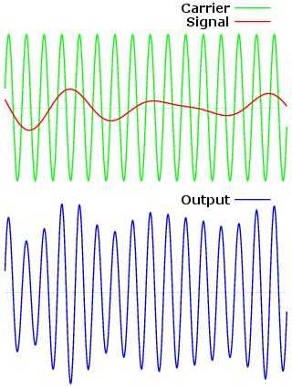 Para la figura de arriba: ilustración de modulación de amplitud de una onda portadora por una señal. El diagrama superior muestra una onda de portador en una set de frecuencia y amplitud (verde) y una señal que se transmitirá (rojo). La señal se utiliza para modular la amplitud de la onda de portador. El diagrama inferior muestra la señal de salida resultante (azul). Observe cómo los picos de la traza de salida (su envoltura) siguen la forma de la señal de entrada.