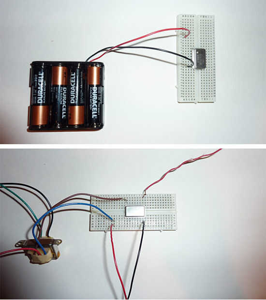 Para la figura anterior: los terminales positivos y negativos del soporte de la batería están conectados a la placa (parte superior). Entonces el lado 1000 ohmios del transformador está conectado en la placa y el cable puente se agrega (abajo).
