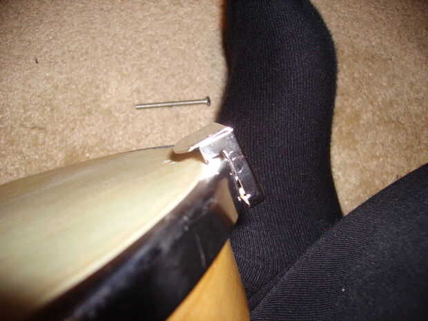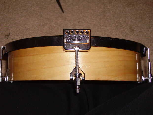En primer lugar, afloje el tensor anterior en el borde del tambor y quitarlo. Mantenga la parte que se acopla a la parte de madera del tambor.