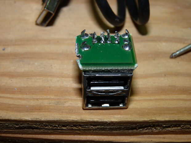 a veces necesita acoplar 2 cables juntos para hacer un cable más largo. Esto es increíblemente fácil de hacer si tienes una de estas pilas de puerto USB de una motherboard vieja. Los puertos USB se apilan directamente encima de la otra. Porque los puertos enfrentan la misma manera, es fácil hacer un paso a través del acoplador de éstos. Sólo tienes que soldar los cables de jumper entre los pines de las 2 filas de encabezados. Sólo había estañado algunos filamentos de alambre y soldar entre las cabeceras.