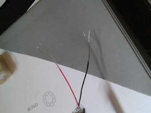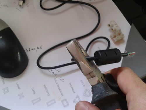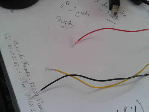 Pour le cable USB, gardez uniquement les fils rouge et noir, les autres ne serviront pas. Une fois coupé, dénuder d'environ 1 à 2 cm.