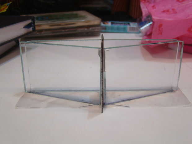 Tenemos que pegar la pieza grande de vidrio y los dos pequeños pedazos de vidrio sobre el plástico o el gobernante, como se muestra arriba:-