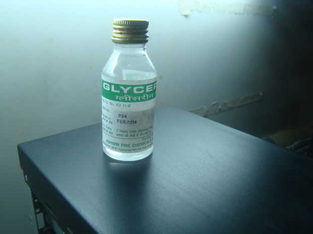 La glicerina es disponible en todas las farmacias o tiendas médicas. Parece que la botella en la imagen de arriba. Costo de =Rs.24 de glicerina para la botella de 100 gramos. Usted puede hacer dos prismas con el contenido de una botella.