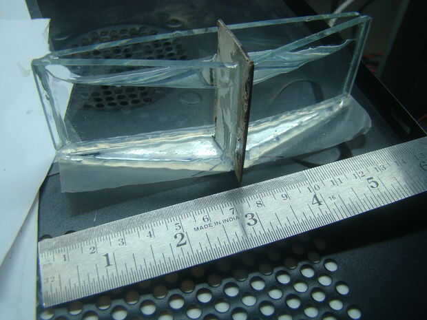 Una vez que todo está todo seco, basta llenar de agua limpia (agua embotellado) en el prisma de cristal, que sólo hemos construido. Si detecta cualquier fuga que quite el agua y aplique más adhesivo de pegamento alrededor de todas las juntas y dejar secar. Llene con agua otra vez y compruebe si hay fugas.