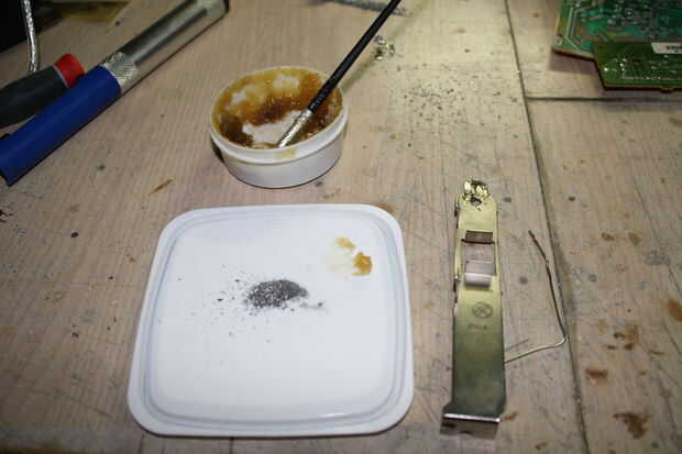Primero vertemos el polvo de soldadura en un pequeño montón en la paleta de mezcla de su elección, elegí una tapa de una Tarrina de ensalada de papa. También deposité un pegote de pasta de flujo cerca de él, no glob directamente en porque no quería que la soldadura que tome mi cepillo.