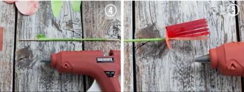 Agregar pegamento en stick, bobina de papel verde en eso del palillo para hacer un tallo. Poner el pistilo redondo en el tallo, las borlas de la bobina en la parte superior del tallo.