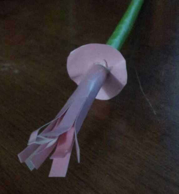 preparaciónPapelesTijeras,PalilloPistola de pegamento-disparosFlorero maceta o florPaso 1: Papel cortar 6 pétalos y 2 hojas, 1 pistilo.Agregar el pegamento en ambos lados.Paso 2: Corte de hojas, pétalos y pistilos por separado. Hacer un tallo con pal