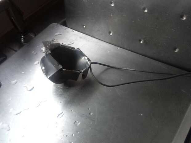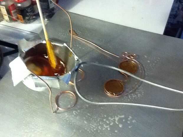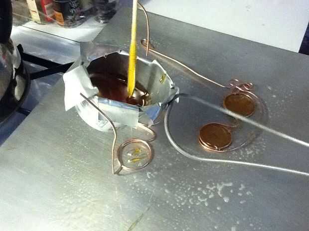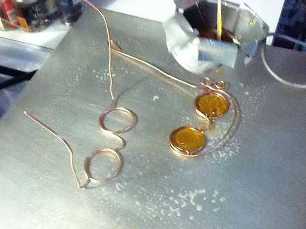 No me gusta verter el caramelo fundido de una sartén pesada directamente en mis gafas, así que yo mismo hice un crisol vertiendo dulces como el de este Instructable. Hice mi crisol de caramelo de una lata de aluminio, un punzón, un pedazo de tres pies de alambre fino y una brocheta de madera. Me gusta mi diseño, porque cuando viertes el caramelo en él, el caramelo fundido se propagan como los pedacitos pasados del vapor de agua intentan escapar de ella. Ya que mi agujero se encuentra en la parte inferior del crisol, no hay tantas burbujas de aire en el chorro de caramelo fundido sale de la parte inferior. También puedo conectar ese agujero con un pincho de madera, y puesto que el agujero está en la parte inferior, no es difícil de encontrar con el pincho. Puesto que las gafas son particularmente pequeñas, ayuda a poder sólo pobres pequeñas cantidades de caramelo.