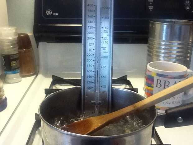 Cuando el caramelo empiece a hervir, poner en su termómetro. Si no tienes un termómetro, puede utilizar el método de agua fría para comprobar cómo hacer el caramelo. Asegúrese de que el bulbo del termómetro esté en el caramelo. Si no llega, tienes que inclinar la bandeja y cubrir la bombilla de vez en cuando para comprobar la temperatura de tus dulces.