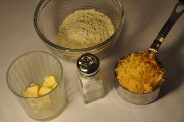Necesita sólo cuatro ingredientes: 1 taza rallado queso de cheddar 1 taza de harina para todo uso 1/4 taza de cubitos de mantequilla 2-3 cucharadas de agua