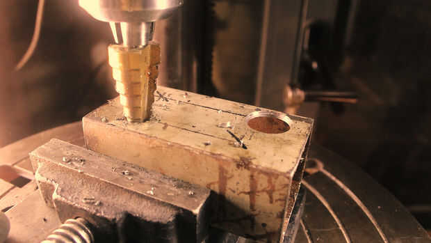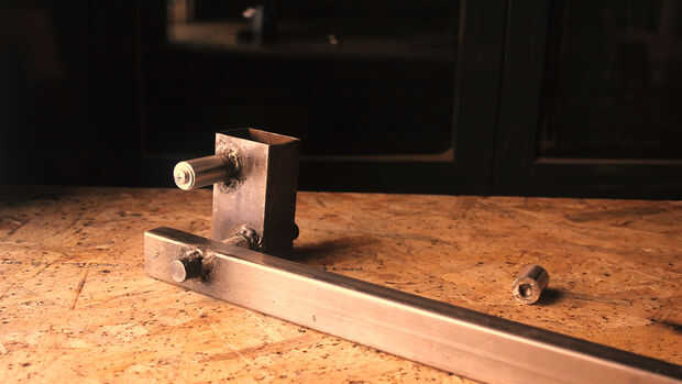 Ahora para la cabeza en flexión. Simplemente perforar dos agujeros separados 50mm para tener cierta influencia y soldado con autógena las mitades de bisagra en su lugar asegurándose de que se inserta la misma profundidad en el tubo de 35x45mm. Uno de lo halveswill de bisagra como un rodillo libre que puede viajar a lo largo de la varilla mientras está siendo doblado y reducir la fricción. Me corte la parte femenina de la bisagra a la mitad para obtener un tubo de acero grueso y atornillar un tornillo en el extremo de la parte masculina para mantener este rodillo en su lugar. Eso es todo! un par de gotas de aceite y es bueno para ir. Entonces sólo puedo insertar un gran bar aún aplicar el apalancamiento necesario