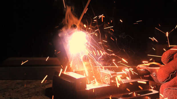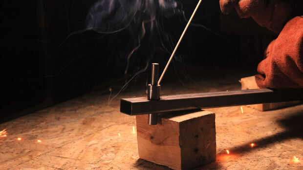 He hecho un agujero en el tubo cuadrado para que una vez que se introduce la bisagra, la distancia entre la bisagra y el borde ajuste la varilla de acero de 10mm. La bisagra la mitad fue soldada con autógena en el lugar y la soldadura fue redondeada con un archivo para asegurarse de que recibe la varilla de acero sin interferencias.