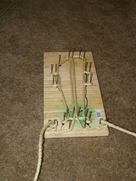 4) traer la cuerda alrededor de los clavos que forman los lazos del talón, y luego finalmente abajo y envuelven varias veces en una cifra 8 a través de los clavos en la parte inferior del tablero. Esto mantendrá todo lo agradable y tenso.