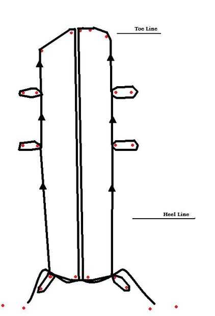 3) al llegar a la parte superior de la sandalia, pase la cuerda a través de los dos clavos superiores que están separadas entre sí una pulgada y tirón firmemente. Continuar reduciendo la cuerda a través de los clavos de la parte inferior, va sobre la cuerda tirada firmemente desde el paso 1
