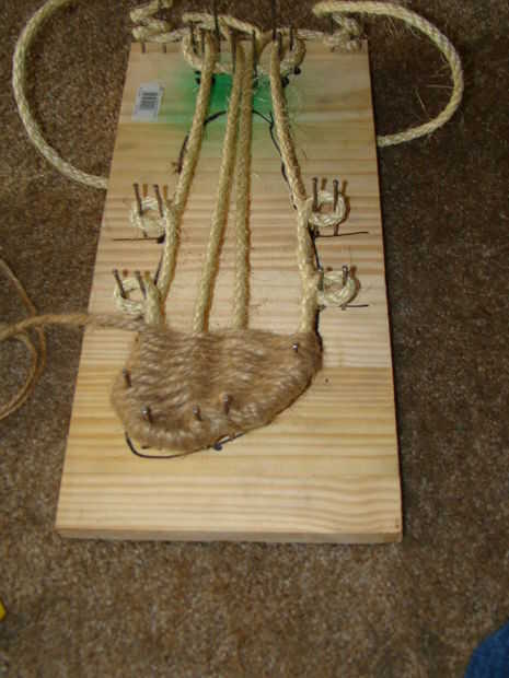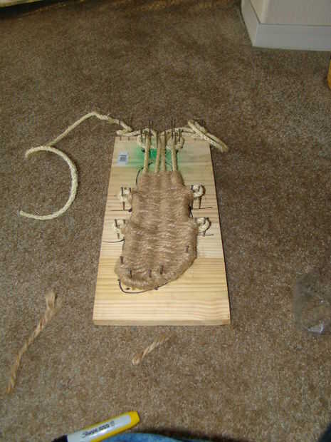 Como terminar cada línea de tejer, utilice sus dedos para empujar hacia abajo como compacto como sea posible con el resto de la guita! Esto depende de la integridad toda de la sandalia y debe llevar esto como bien como humanamente posible o el zapato se deshagan al intentar empatar. El primer par que hecho cayó aparte porque no empacar suficiente guita en la sandalia.