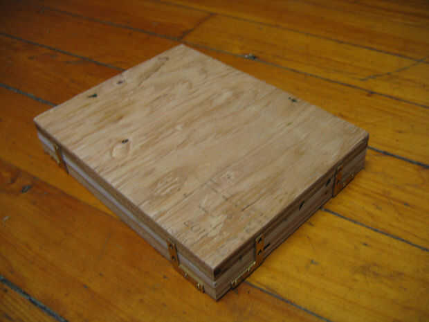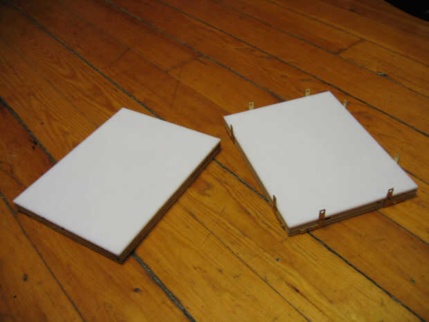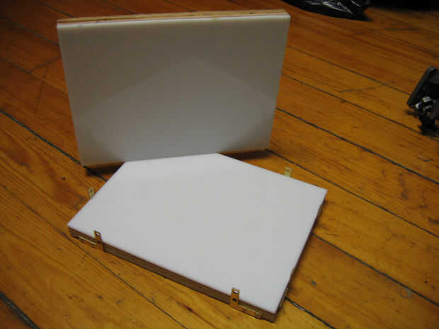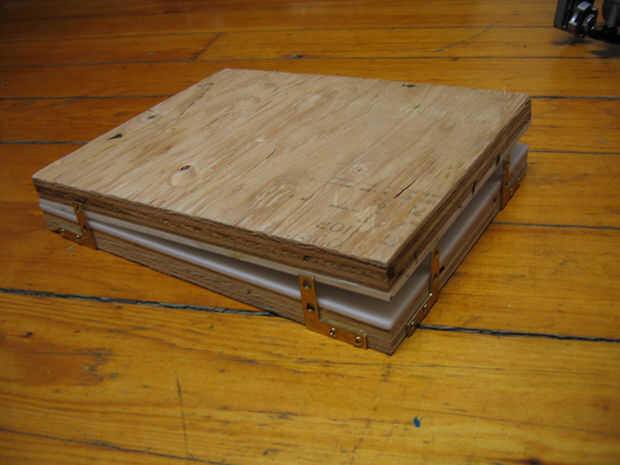 Empecé con una hoja de. 5" madera contrachapada y un. 25" hoja de PTEG. Bordillo de madera a un lado del plástico y había pegado a la madera contrachapada con cemento de contacto. Después el pegamento, recortar el tablero en dos paneles de 8.5 "x 11" (las hojas plásticas están ahí para proporcionar una buena superficie plana para presionar el papel contra el, la madera es la que incluso la presión de las pinzas y proporcionan integridad contra deformación). Luego añadí los soportes de latón a lo largo de los lados para mantener todo en su alineación.