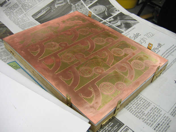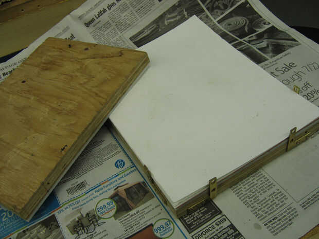 Ahora, todo lo que queda por hacer es montar las piezas y de la abrazadera. Aquí es donde creo que debo haber ido diferentemente. Me dijeron por un grabador que patrones realzados mantienen mejores si se hacen cuando el papel está húmedo. Por lo tanto, spritzed las páginas antes de les sujeción. Sin embargo, esto se parecía a las páginas. Después de algunos experimentos más, decidí colgar el mojado y un seco solo grabado, y parecía bien, y sin distorsión, pero no tuvo tiempo de hacer más pruebas. Mi plan original era que realza el papel y luego ejecutarlo a través de una impresora. Las páginas distorsionadas no carrete correctamente y por lo tanto fueron mal. En el futuro, creo que voy a tratar de impresión las imágenes primero y luego les de grabación en relieve.