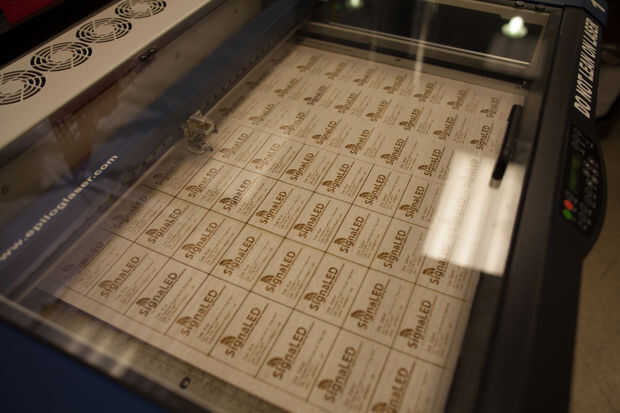 Estas tarjetas fueron hechas usando un cortador láser en mi local hackerspace, TechShop. "He hecho en TechShop"