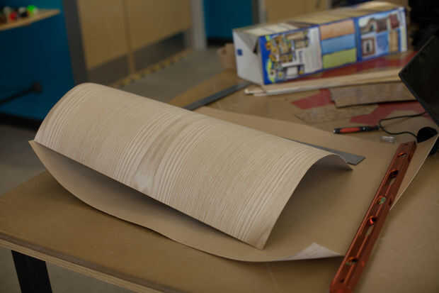 El vaneer que estoy utilizando tiene un adhesivo en la parte trasera que se activa por el calor.