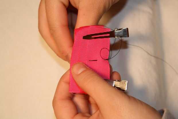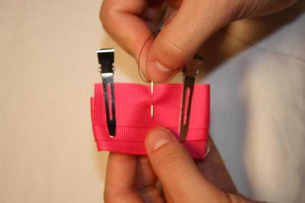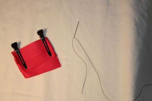 Utilice clips para asegurar la cinta permanece en su lugar.  Enhebrar la aguja y coser todas las piezas juntas.