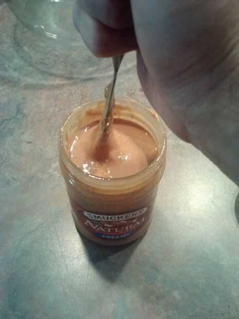 Primero necesita mezclar la mantequilla de maní.  Con mantequilla de maní orgánica, el aceite se instala en la parte superior, por lo que esté totalmente mezclado en.  Coge el cuchillo de la mantequilla y empieza a revolver!