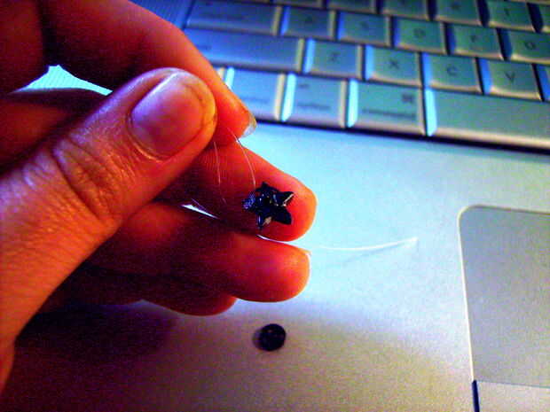 Para poner un grano, corté algunas sedal y poner cualquiera de los extremos en dos de los agujeros para coser-en, que vienen hacia fuera sobre la parte plana, luego un nudo cuadrado antes de roscar los dos extremos a través de mi cuenta.