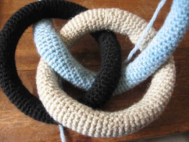 Tomar el aro desunido (aro de tres) y pase el extremo bajo aro dos aros uno, bajo el aro de dos y aro, como en las fotos.