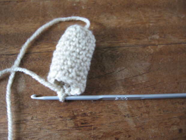 Mantener ganchillo hasta que sea aproximadamente la misma longitud que el tubo, luego cortar el hilo dejando un montón de cose los extremos juntos más adelante y tire a través del último lazo de ganchillo.