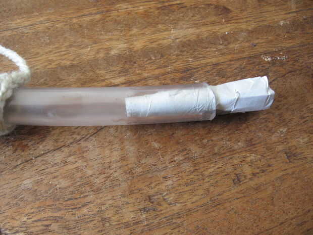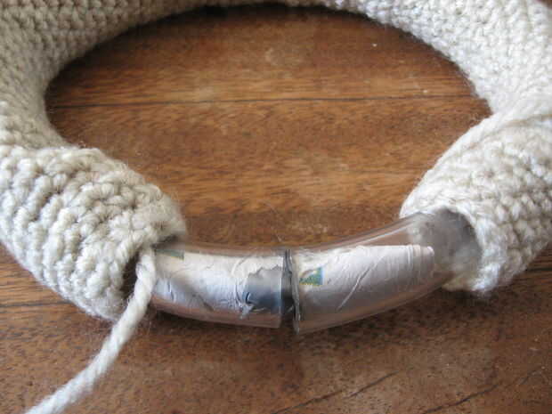 Inserte el unidor de periódico en un extremo de la tubería y luego el otro. Usted puede tiene que crujir encima de la funda de ganchillo para que pueda ver lo que estás haciendo.