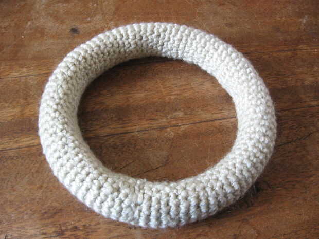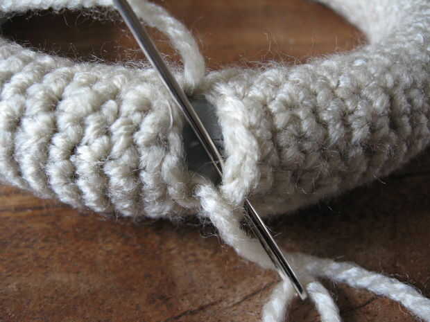 Coser los dos extremos de la funda de ganchillo con la larga cola a la izquierda desde el extremo del ganchillo.